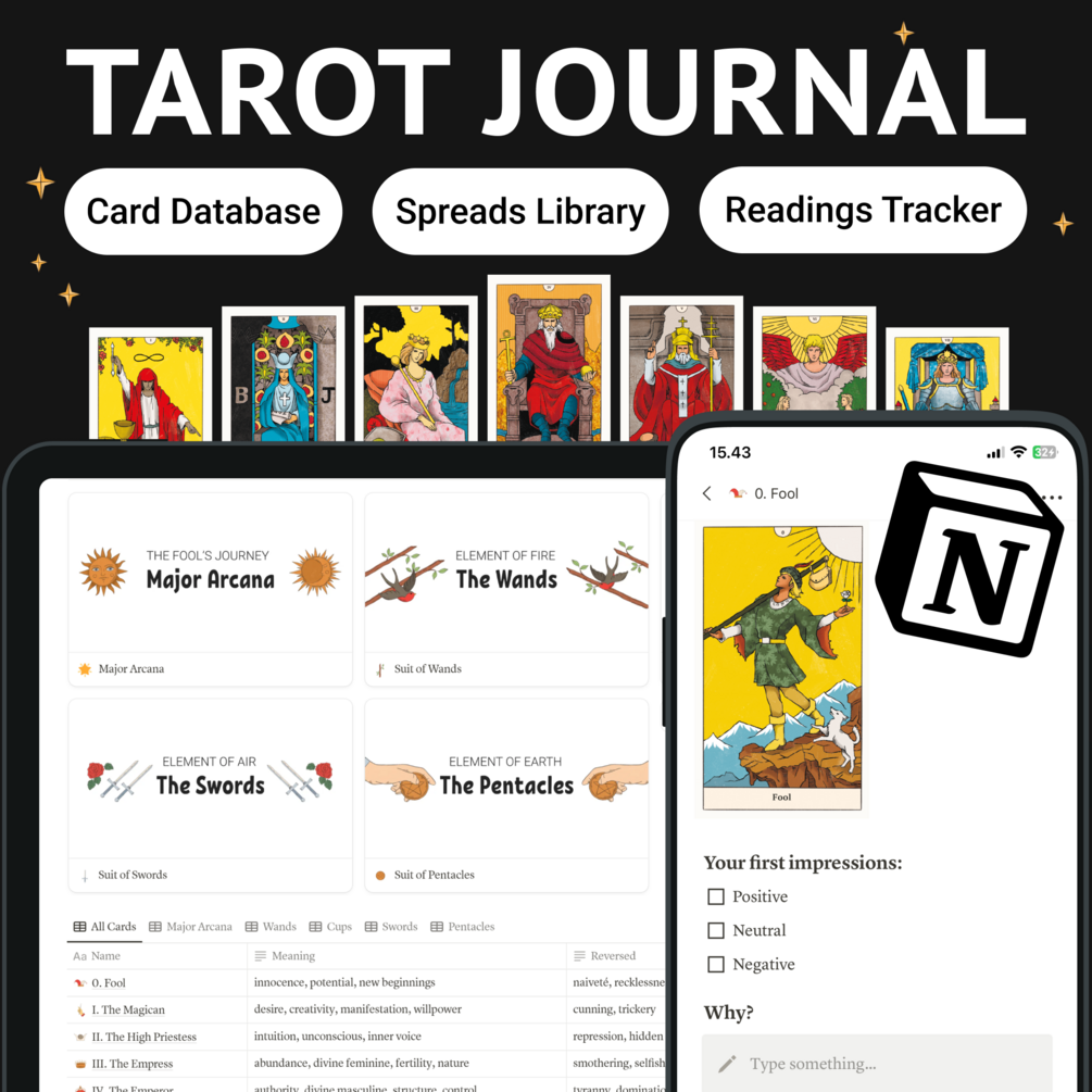The Ultimate Notion Tarot Journal offers a gentle, beginner-friendly path to a more intuitive practice. Capture your readings, see the patterns unfold, and deepen your personal connection to the cards — with clarity and intention.