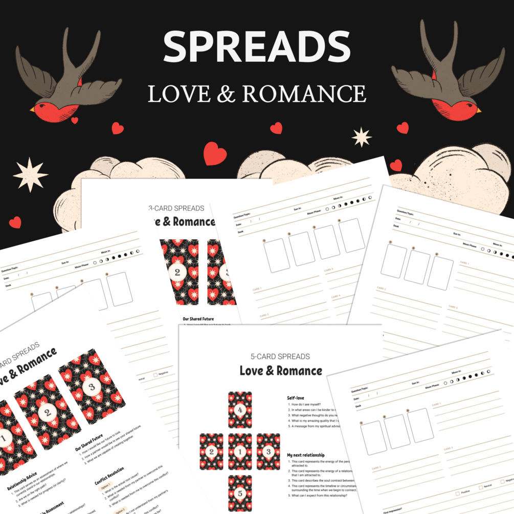 A collection of spreads to explore love, relationships, and uncover insights into romance and compatibility.